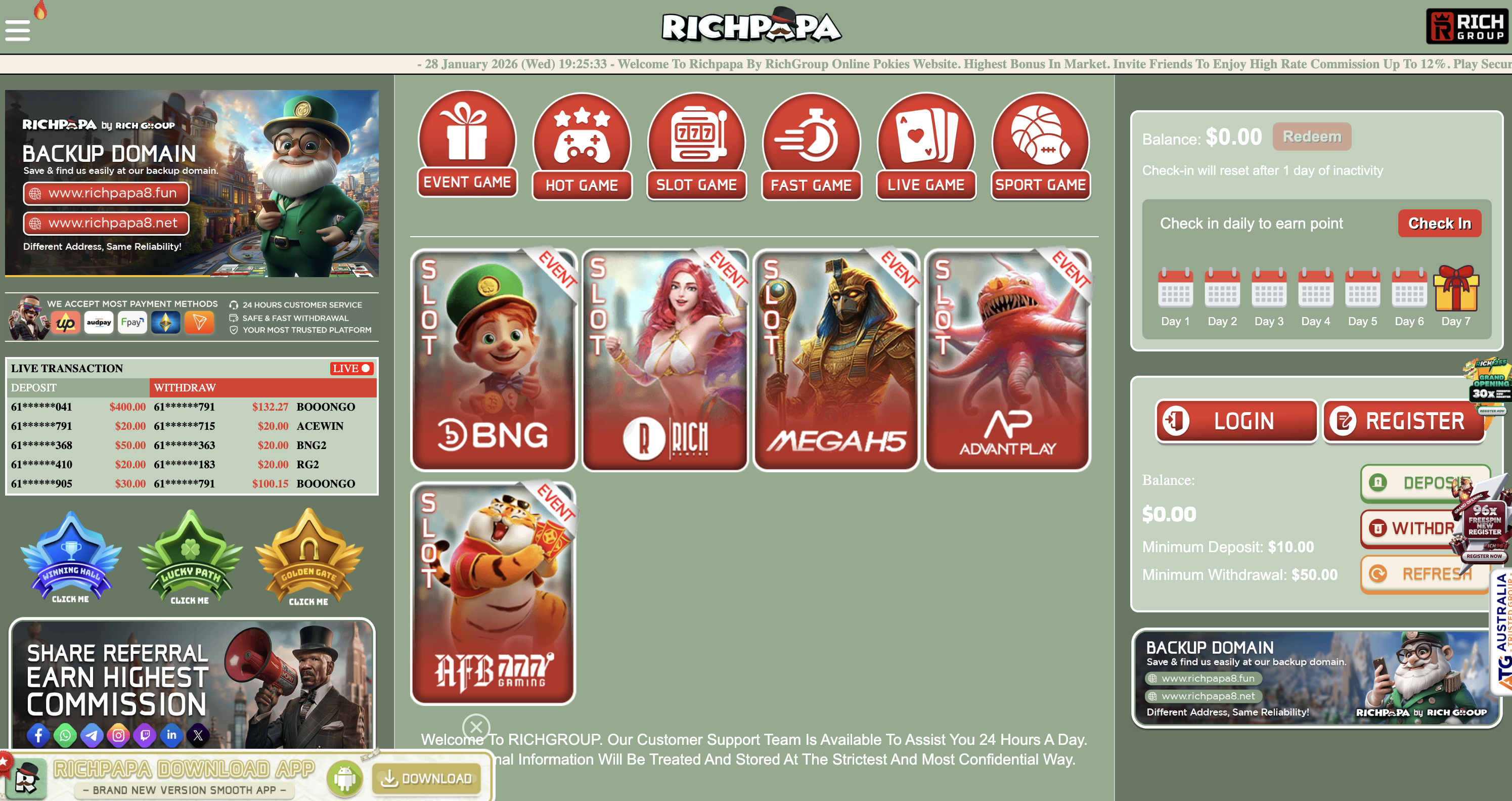 Daily rewards + mini games, PayID-style banking focus, pokies/live casino overview, and trust checks.